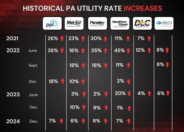As the chart above shows, Pennsylvania utility rates have consistently increased year after year — sometimes by double digits. And these increases compound over time. Utilities can raise rates whenever they want. Homeowners have zero control.